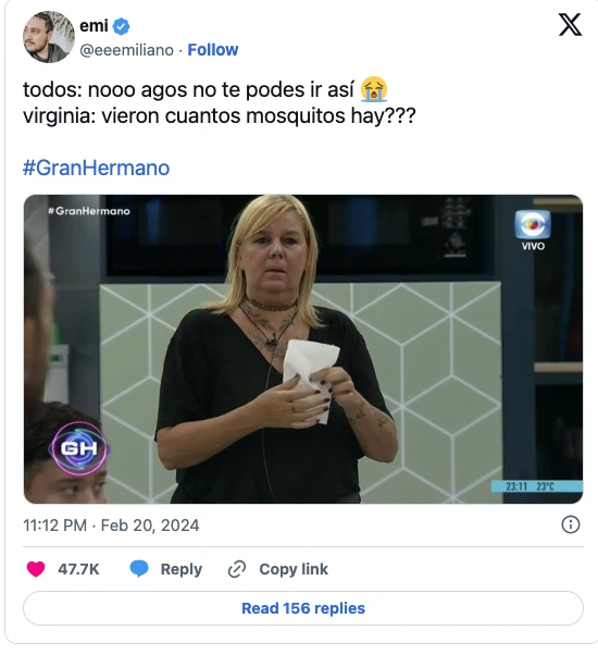 Además, uno de los usuarios de la red social destacó el particular comentario de Virginia Demo al salir al jardín de la propiedad en Martínez para despedir a Agostina que, de un momento al otro, sin haber hecho una valija siquiera, se tenía que ir. "¿Vieron cuántos mosquitos hay?".