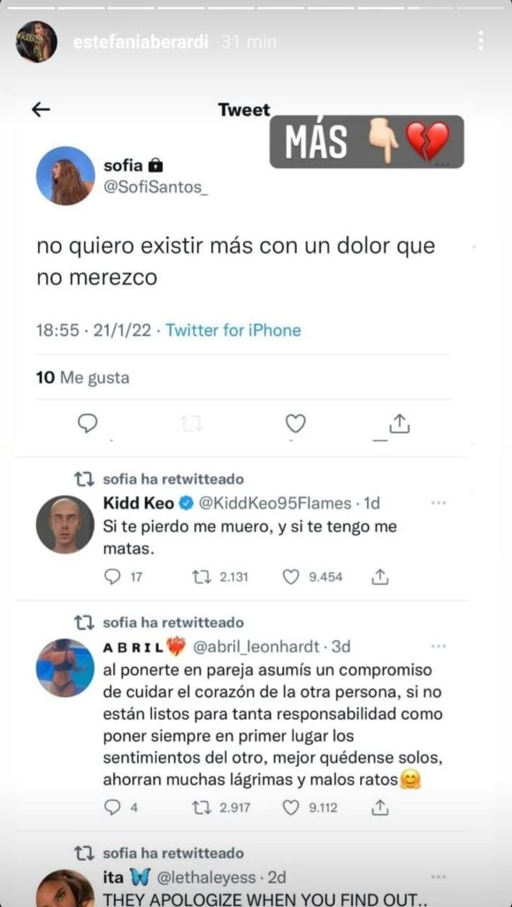 Hace algunos días que Santos comparte mensajes en su cuenta privada de Twitter y Estefi Berardi los publica: "No lucharé por amor si no me encuentras a mitad de camino", "Wow, baldazo de agua fría. Si sienten algo raro, es porque algo raro hay. Siempre", fueron algunos de los mensajes.