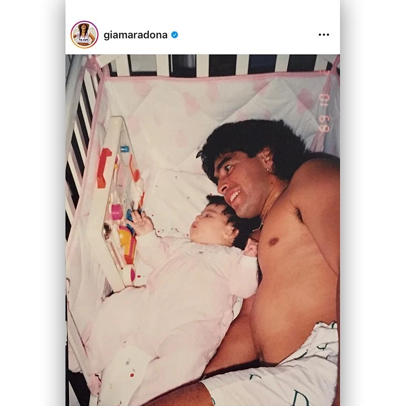 La hija mayor del astro, compartió una foto de cuando era pequeña. Diego la sostenía en sus brazos y se ve la camiseta número 10 del astro: "Sumale 10 a esa camiseta y sé feliz siempre. Te amo papá", escribió la actriz.