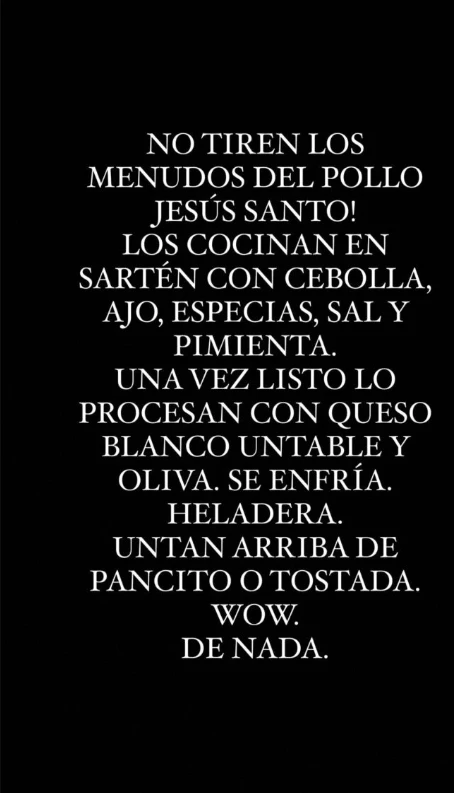 "¡No tiren los menudos de pollo! Los cocinan en una sartén con cebolla, ajo, especias, sal y pimienta. Una vez cocidos, los procesan con queso blanco untable y aceite de oliva. Luego, se enfría en la nevera. Pueden untarlo en pan tostado. ¡Es increíble!", dijo en sus redes.