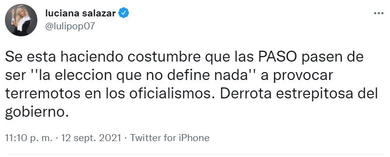 "Peleas entre el jefe de Gabinete (Santiago Cafiero), (Juan Pablo) Biondi y el ministro Wado de Pedro sobre quién informó mal los números", advirtió Lulipop, luego de señalar que, en estas elecciones, había “perdido la grieta”.