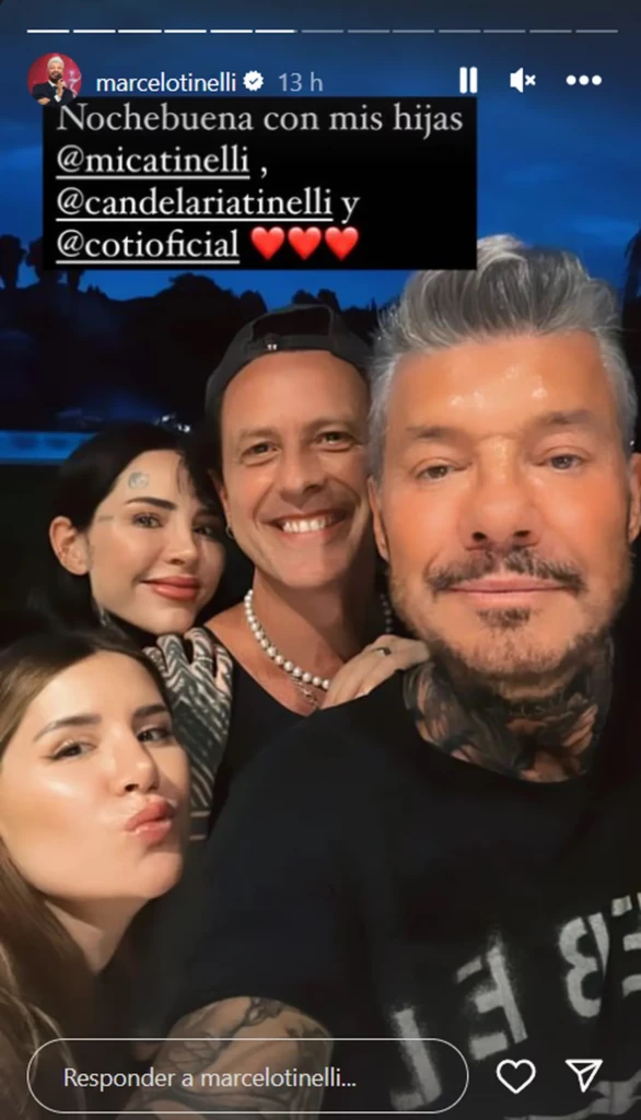 Y uno que también estuvo bastante activo en las redes sociales durante la noche buena fue Marcelo Tinelli. El conductor del Bailando la pasó junto a sus dos hijas mayores, Coti, su yerno, y la infaltable compañía de Luciano El Tirri con su novia Mimi.