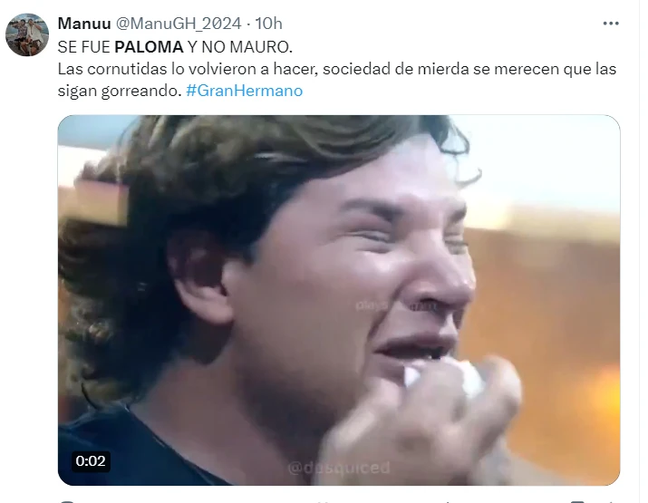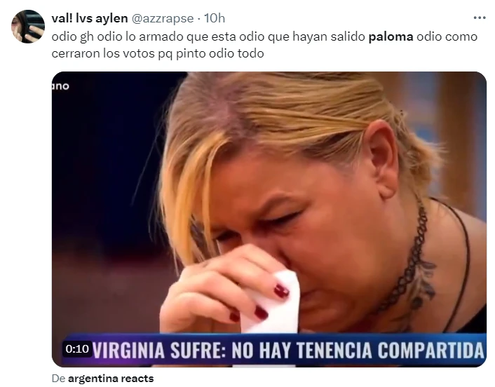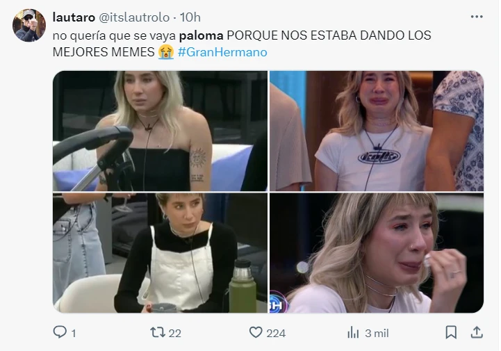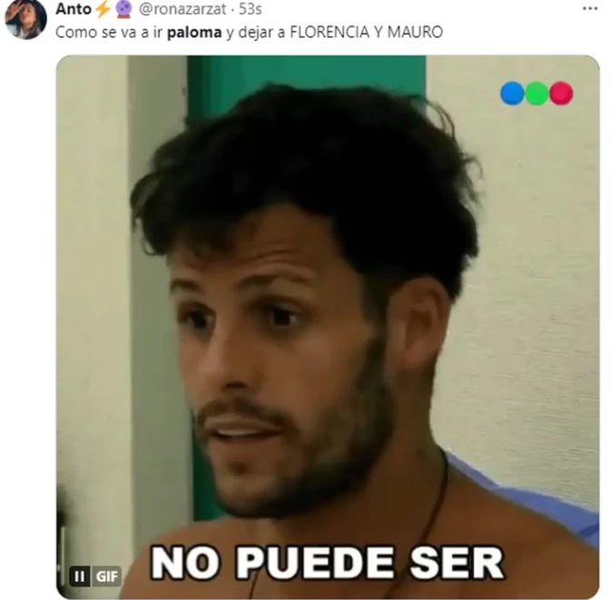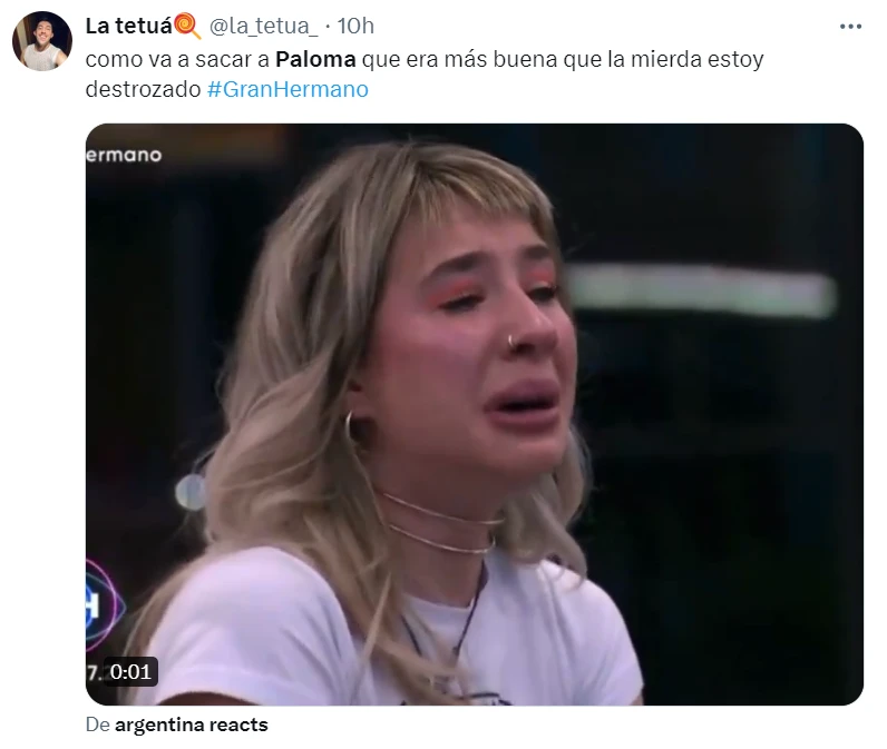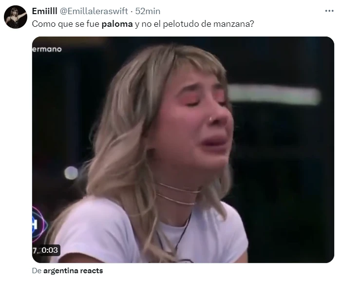 “No quería que se vaya Paloma porque nos estaba los mejores memes”; “No se lo merecía”; "Gracias por todos los memes que nos diste, te vamos a extrañar”; “¡Cómo van a sacarla si era la más buena!”; “Se tenía que ir Mauro”, fueron algunas de las reacciones que inundaron Twitter en la medianoche del domingo haciéndose eco de la salida de la "Pepona".
