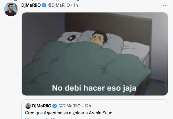Aguien hasta se animó a bromear con Gran Hermano y al "mejor estilo Santiago del Moro" pidió que la gente mande "Arabia al 9009". Otro usuario consideró que lo peor no era el resultado, sino que todavía le quedan 29 cuotas para pagar el televisor que compró para ver a Argentina. El estado anímico de los hinchas fue otro asunto muy "memeable". Hubo todo tipo de chistes, y todos anunciando que se viene una semana muy dura y difícil de sobrellevar. Y sí, hasta el sábado estaremos de capa caída.
