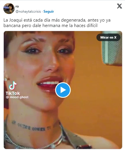 "La Joaqui está cada día más degenerada, antes yo ya bancana pero dale hermana me la haces difícil", escribió una usuaria de X, mientras que otro sostuvo que "Parece más bien un video de Pornhub". "Había límites Joaqui", manifiesta otra tuitera.