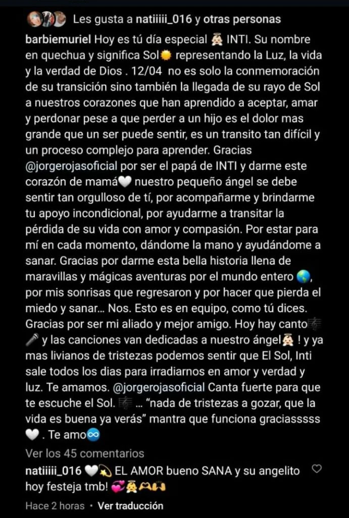 Fue entonces que agregó: "Gracias Jorge Rojas por ser el papá de Inti y darme este corazón de mamá… Nuestro pequeño ángel se debe sentir tan orgulloso de tí, por acompañarme y brindarme tu apoyo incondicional, por ayudarme a transitar la pérdida de su vida con amor y compasión. Por estar para mí en cada momento, dándome la mano y ayudándome a sanar".