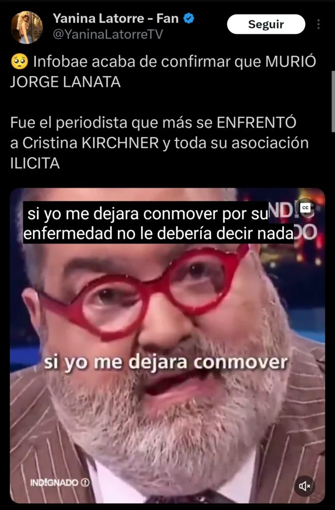 Una de las primeras que publicó un mensaje a través de Twitter fue su amiga Yanina Latorre. "Infobae acaba de confirmar que MURIÓ JORGE LANATA. Fue el periodista que más se ENFRENTÓ a Cristina Kirchner y toda su asociación ILICITA", escribió la panelista de LAM.