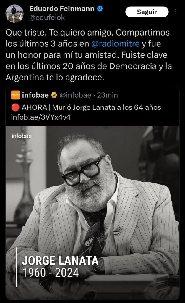 A su vez, su colega de Radio Mitre, Eduardo Feinmann, le dedicó en redes: "Que triste. Te quiero amigo. Compartimos los últimos 3 años en @radiomitre y fue un honor para mí tu amistad. Fuiste clave en los últimos 20 años de Democracia y la Argentina te lo agradece".