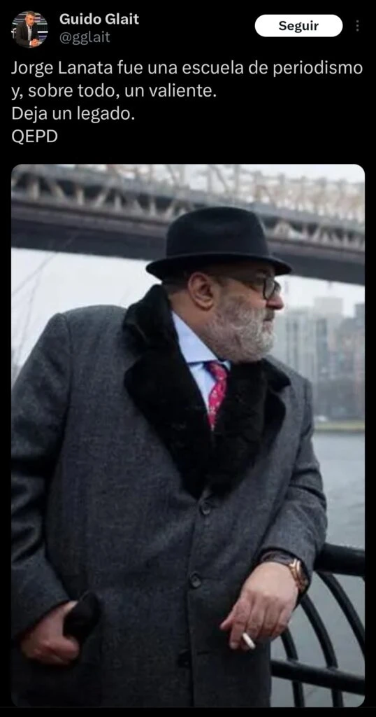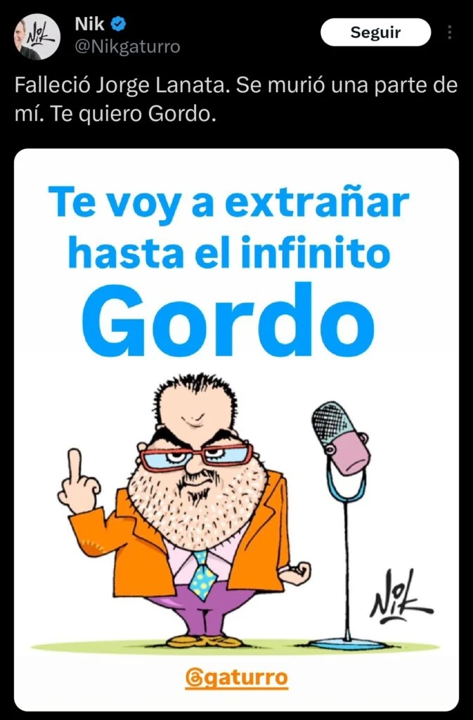 Siguiendo con los mensajes de despedida para Jorge Lanata, Nik sentenció: "Falleció Jorge Lanata. Se murió una parte de mí. Te quiero Gordo". El periodista deportivo Guido Glait compartió: "Jorge Lanata fue una escuela de periodismo y, sobre todo, un valiente.Deja un legado.QEPD".