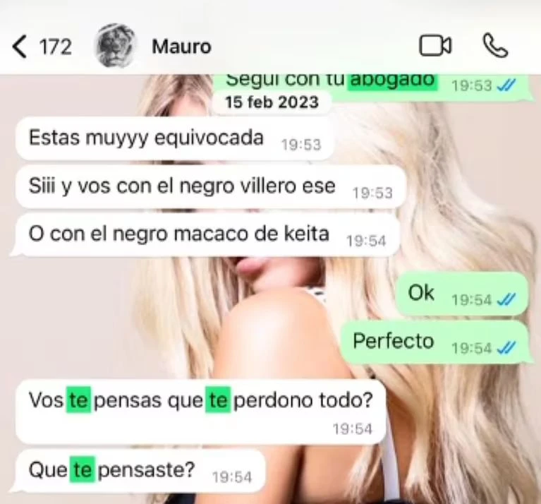 “Estás muy equivocada. Seguí con el negro villero ese o con el negro macaco de Keita”, fue una de las frases más fuertes que se lee en el ida y vuelta entre Mauro y Wanda. Y fue la cuenta de X @elejercitodelam que también publicó otra foto donde el deportista menosprecia nuestro país.