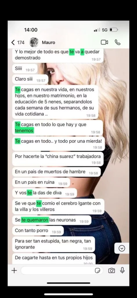 “Te cagás en todo lo que hay y que tenemos, ¡Te cagás en todo y todo por una mierda...! Por hacerte la China Suárez trabajadora en un país de muertos de hambre, en un país en ruinas. Y vos te la das de diva... se ve que te comió el cerebro L-Gante con la villa y los villeros. Se te quemaron las neuronas con tanto porro para ser tan estúpida, tan negra, tan ignorante de cagarte... hasta en tus propios hijos”, sumó.
