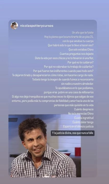 “Un año que te fuiste. Hoy lo pienso: qué locura tirarte de un piso 21, con lo que amabas tu cuerpo. ¿Qué habrá sido lo que te llevó a hacer eso? Qué solo estabas, Chino”, arranca el texto que Nicolás subió a sus Instagram Stories en el que nunca menciona los nombres de Marta y Felipe.
