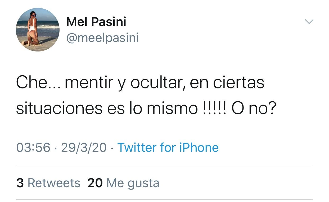 A las 3.56 de la mañana, Mel escribió un curioso mensaje ¿dedicado a su novio?: "Che... mentir y ocultar, en ciertas situaciones es lo mismo!! O no?". El mismo mensaje lo subió a sus stories y dejó la respuesta abierta a sus seguidores.