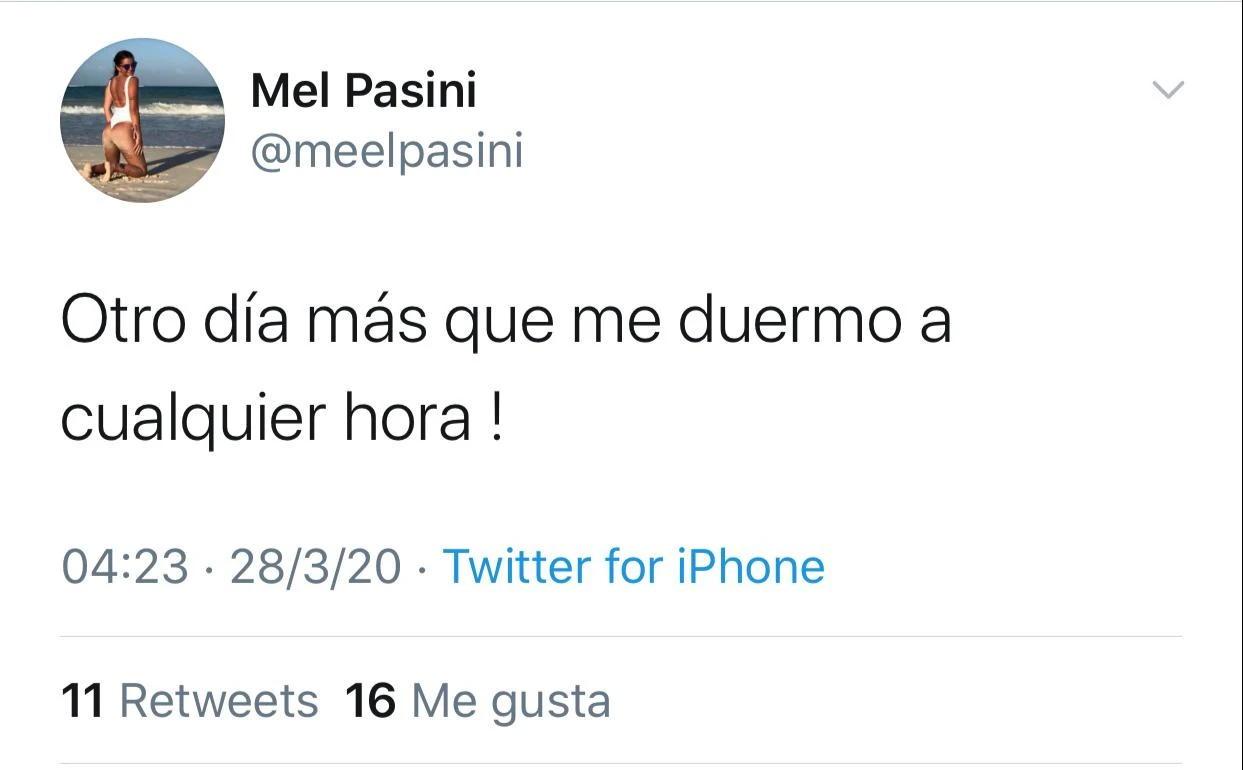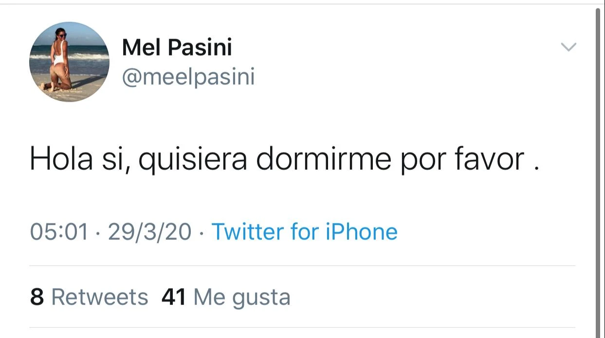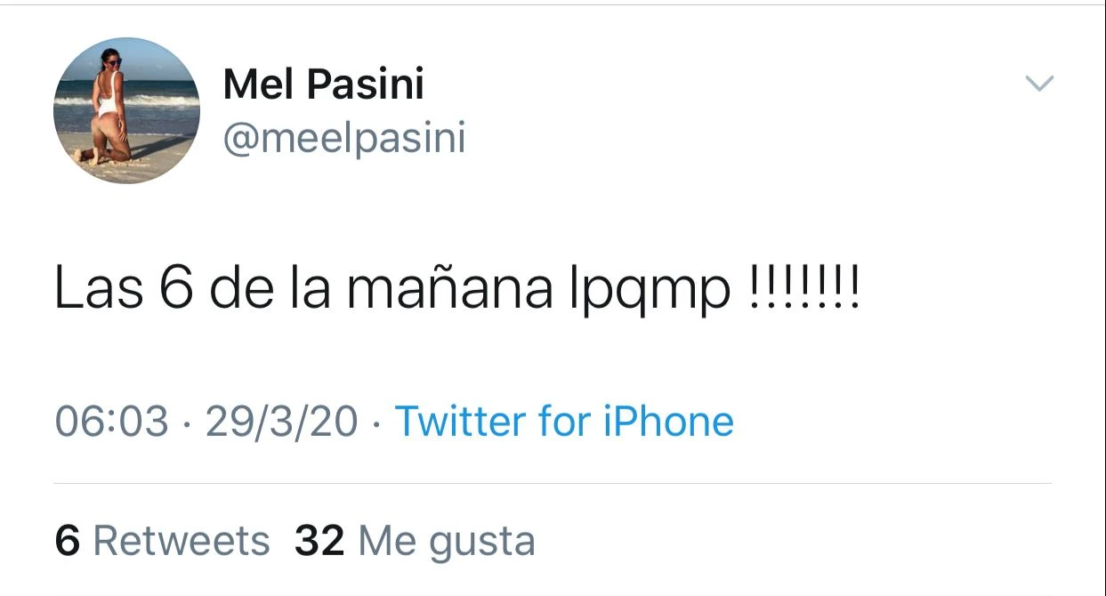 Ya angustiada, a las 5 de la mañana, Mel implora poder dormirse "Hola si, quisiera dormirme por favor". Una hora después, a las 6 seguía sin poder conciliar el sueño: "Las 6 de la mañana lpqmp!".
