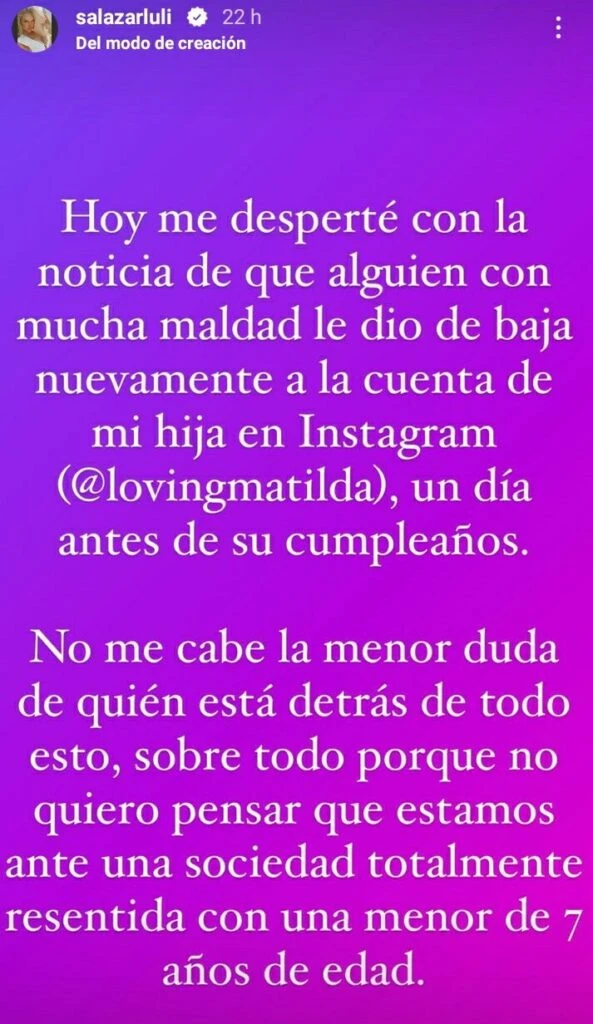 “Hoy me desperté con la noticia de que alguien con mucha maldad le dio de baja nuevamente a la cuenta de mi hija en Instagram (@lovingmatilda), un día antes de su cumpleaños. No me cabe la menor duda de quién está detrás de todo esto, sobre todo porque no quiero pensar que estamos ante una sociedad totalmente resentida con una menor de 7 años de edad”, sentenció Luciana, en una clara referencia hacia quien fue su pareja por siete años (entre 2011 y 2018, con varios vaivenes en la relación).