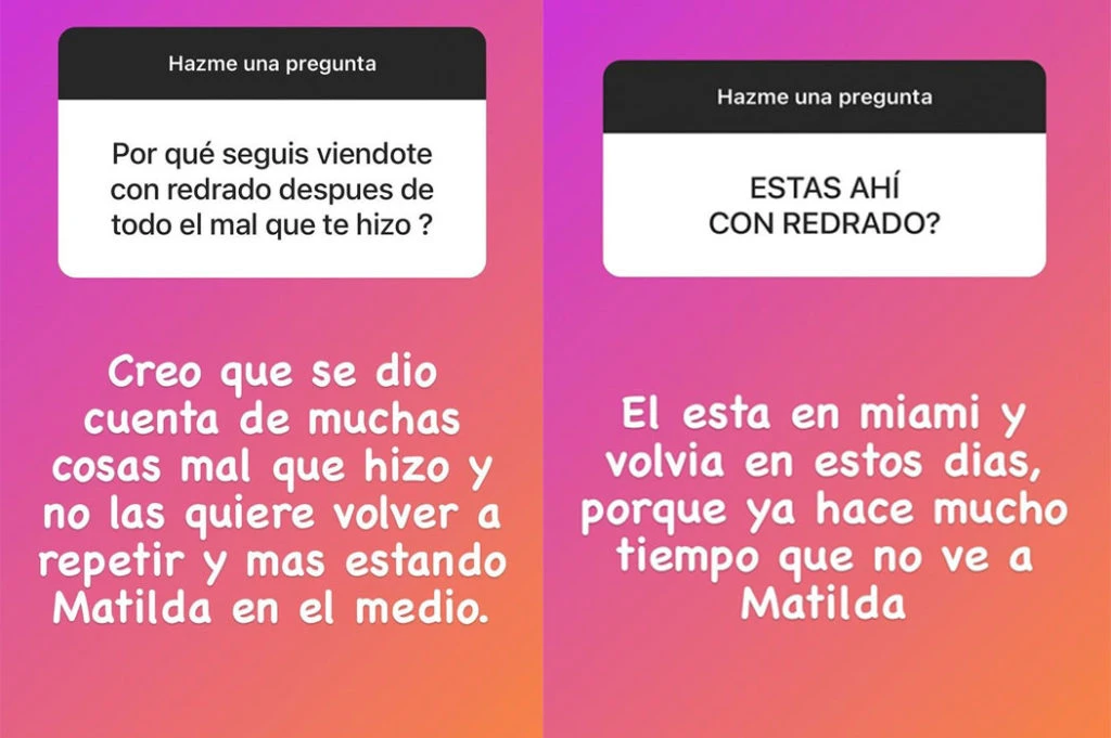 Por otra parte, Luli dejó boquiabiertos a sus más de un millón y medio de seguidores, al responder “por qué se sigue viendo con Redrado después de todo el mal que le hizo”, por lo que dejó más que a la vista la reconciliación: “Creo que se dio cuenta de muchas cosas que hizo mal y no las quiere repetir; y más estando Matilda en el medio”.
