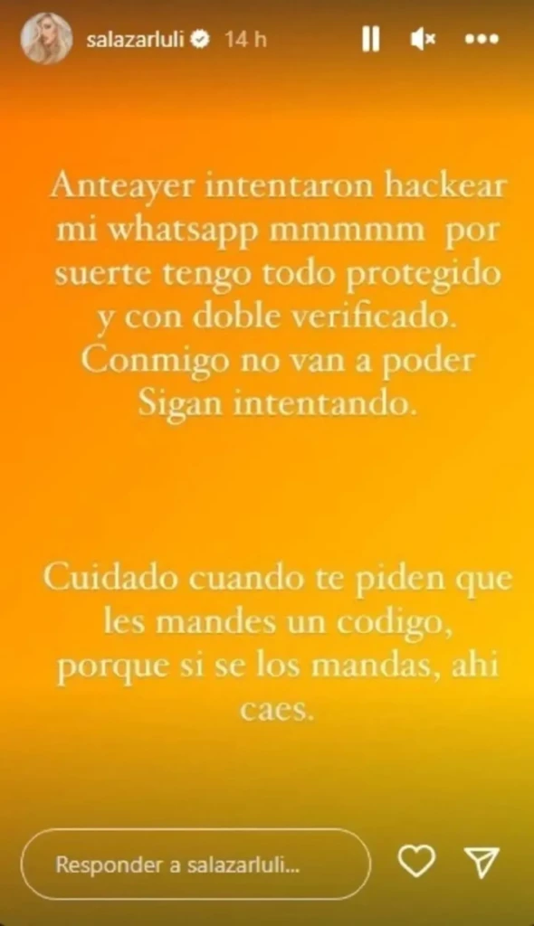 "Anteayer (por el martes) intentaron hackear mi WhatsApp. Mmmmmm por suerte tengo todo protegido y con doble verificado. Conmigo no van a poder. Sigan intentando", denunció Luciana y alertó: "Cuidado cuando te piden que les mandes un código, porque si se los mandás, ahí caes".