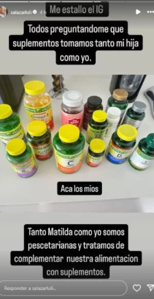 “Tanto Matilda como yo somos pescerarianas y tratamos de complementar nuestra alimentación con suplementos”, señaló la modelo al indicar que desde que había mostrado el primer video se le había llenado la casilla de IG de mensajes y preguntas.
