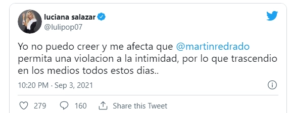 Si bien la mediática no quiso dar declaraciones en los medios, realizó un desesperado pedido a Martín a través de su cuenta de twitter, allí posteó: "Yo no puedo creer y me afecta que Martín Redrado permita una violación a la intimidad, por lo que trascendió en los medios todos estos días..", apuntó contra su ex Luli.