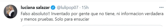Desde su cuenta de twitter la rubia también sumó que el rumor es "¡¡falso absoluto!! Inventado por gente que no tiene ni información verdadera y menos pruebas. Sólo para ensuciar".