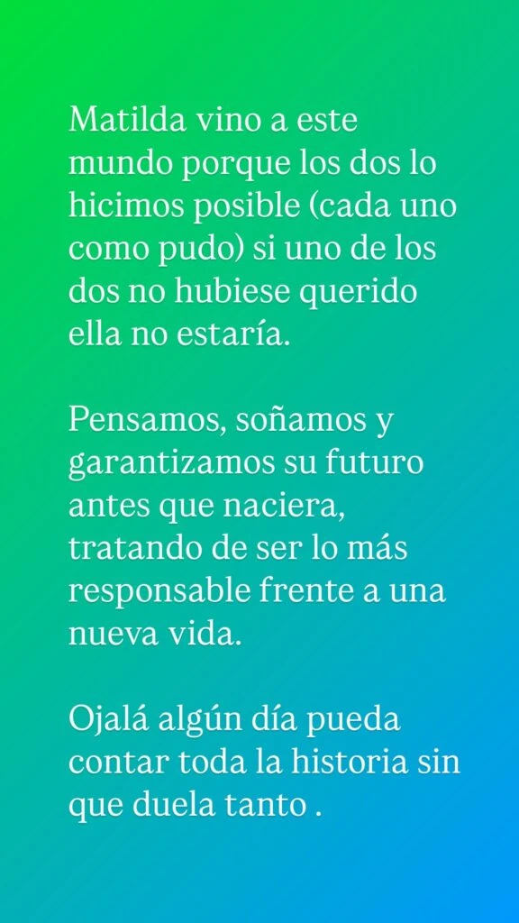 “Hay muchas formas de ser padre, pero no todos lo llevan con la misma responsabilidad de lo que esa palabra significa. Matilda vino a este mundo porque los dos lo hicimos posible, cada uno como pudo. Si uno de los dos no hubiese querido, ella no estaría.” Lanzó.