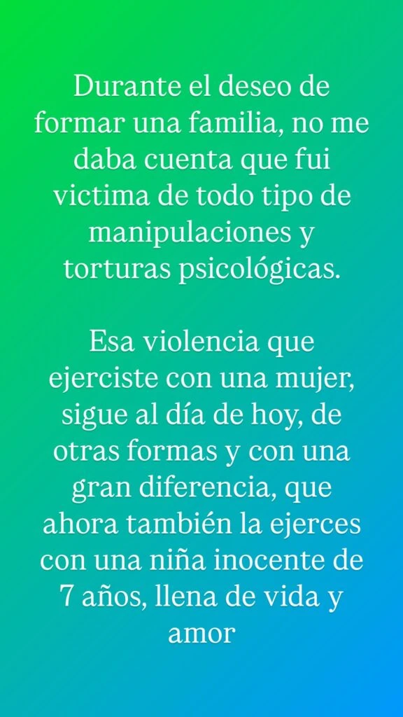 Y siguió muy firme y enojada la modelo: "Esa violencia que ejerciste con una mujer sigue al día de hoy de otras formas. Y con una gran diferencia: ahora también la ejerces con una niña inocente de 7 años, llena de vida y amor.”