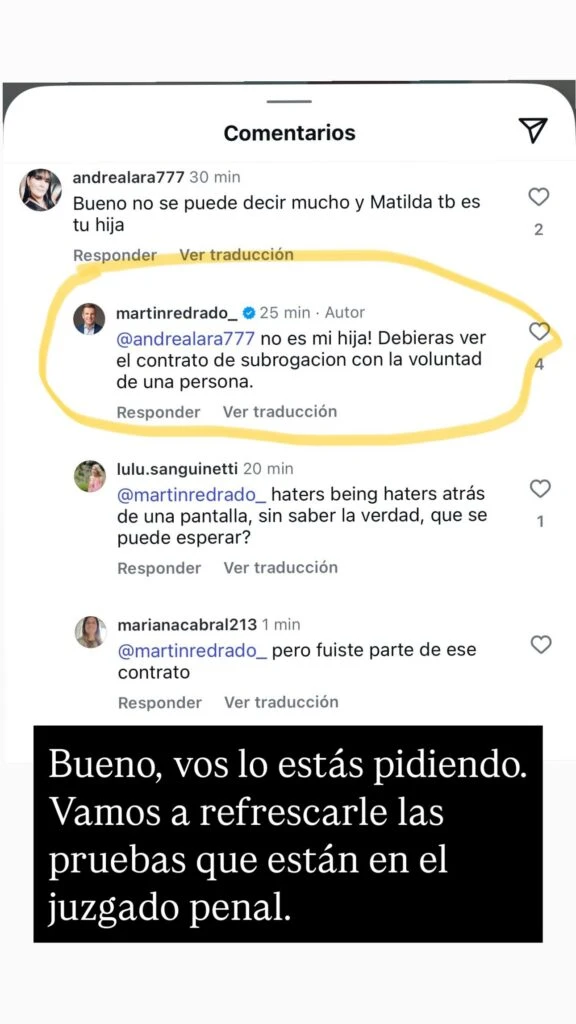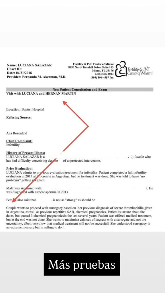 En otra historia, subió una imagen del contrato legal y sentenció: “Dicen que una imagen vale más que mil palabras, pero parece que ni los documentos médicos alcanzan para refrescar ciertas memorias selectivas, no te preocupes, Martín. Si tanto te cuesta recordar nuestras visitas conjuntas al centro de fertilidad, siempre puedo ayudarte con archivos.”