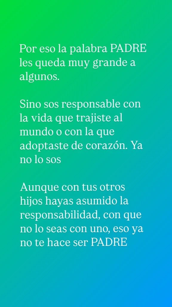 Y añadió con dureza: “Si no sos responsable con la vida que trajiste al mundo o con la que adoptaste de corazón, ya no lo sos. Aunque con tus otros hijos hayas asumido la responsabilidad, con que no lo seas con uno, eso ya no te hace ser padre.”