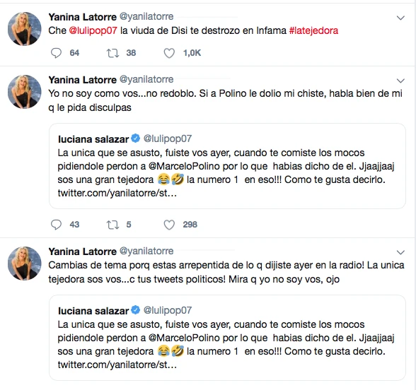 Sin dejar de lado estos escándalos, Yanina Latorre apuntó contra su perfil de politóloga y le escribió: “No hermosa! Decí que te quiero! Te voy a seguir explicando, recibí los mensajes durante tu nota! Los vio Polain! (por Polino). No es telefono descompuesto!” y agregó: “Me quedé pensando...en tus tweets sobre politica “redactás” distinto”.