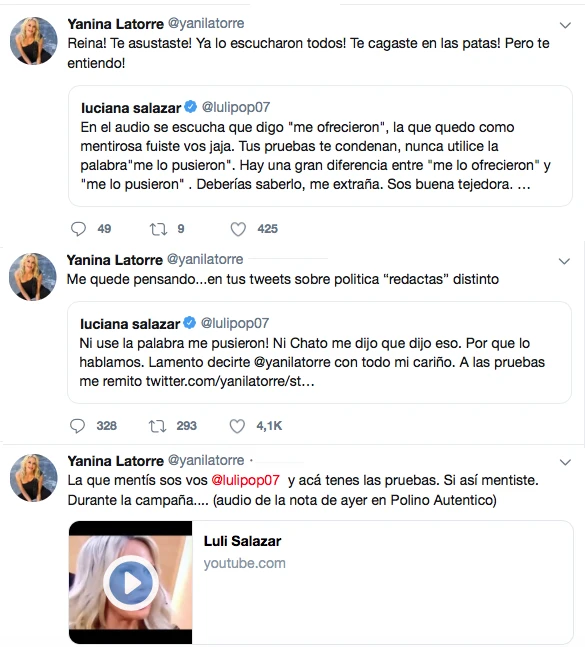 Pero a pesar de que la entrevista no pasó a mayores, las mediáticas decidieron continuar su guerra personal a través de Twitter, luego de que Luciana Salazar explicara su situación y Yanina Latorre le respondiera sin tardanza.