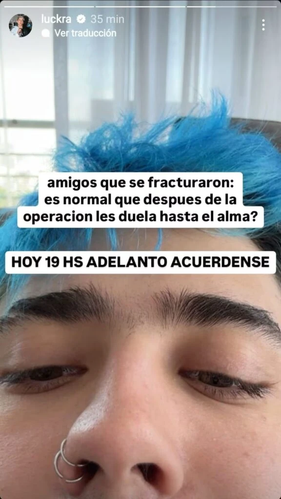 Mientras espera presentar alguna mejoría, el cantante anunció que este domingo a las 19 hará un adelanto de su nuevo single Robame un beso. Sin embargo, en otra de sus historias Luck Ra aclaró que se fracturó y pidió opiniones de sus fans. “Amigos que se fracturaron: ¿Es normal que después de la operación les duela hasta el alma?”, preguntó, evidenciando que más allá de haber pasado por cirugía también se encuentra físicamente muy dolorido por este episodio.