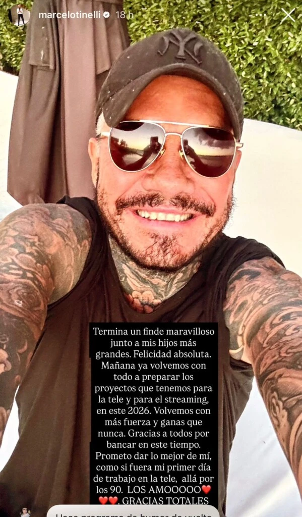 “Gracias a todos por bancar en este tiempo. Prometo dar lo mejor de mí, como si fuera mi primer día de trabajo en la tele, allá por los 90. Los amoooo. Gracias totales”, remató Marcelo, quien intenta recargar energías y rearmarse, y tras estar bien con sus afectos, preparar la vuelta al ruedo.