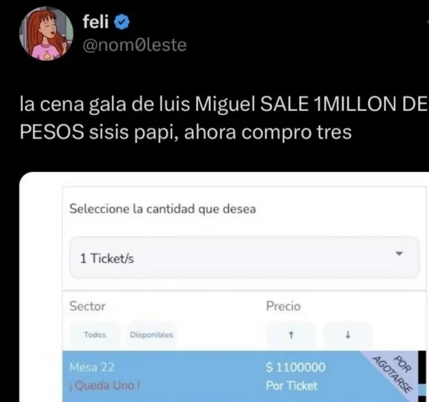 La cita será el 5 de marzo de 2024. Como ya se dijo, habrán cambiado muchas cosas desde ahora a ese momento. Hasta es probable que ya se conozca al campeón del Bailando que acaba de empezar la semana pasada. Ese día, 16 días antes del inicio del otoño, podrán ir a ver a Luis Miguel sólo aquellos que hayan comprado sus entradas en valores que van desde los 770.000 pesos las "más baratas" hasta el 1.100.000 que cuestan la ubicaciones más privilegiadas. En fin.