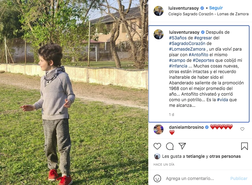 Ahora lo hizo. Y no sólo publicó la que puede considerarse la primera foto de Antoñito (¡Está hermoso!), sino que también le escribió algo que puede llamarse una carta para su hijo. "Después de 53 años de egresar del Sagrado Corazón de Lomas de Zamora, un día volví para pisar con Antoñito el mismo campo de deportes que cobijó mi infancia", arrancó Ventura, director de Paparazzi desde su fundación hasta 2015.