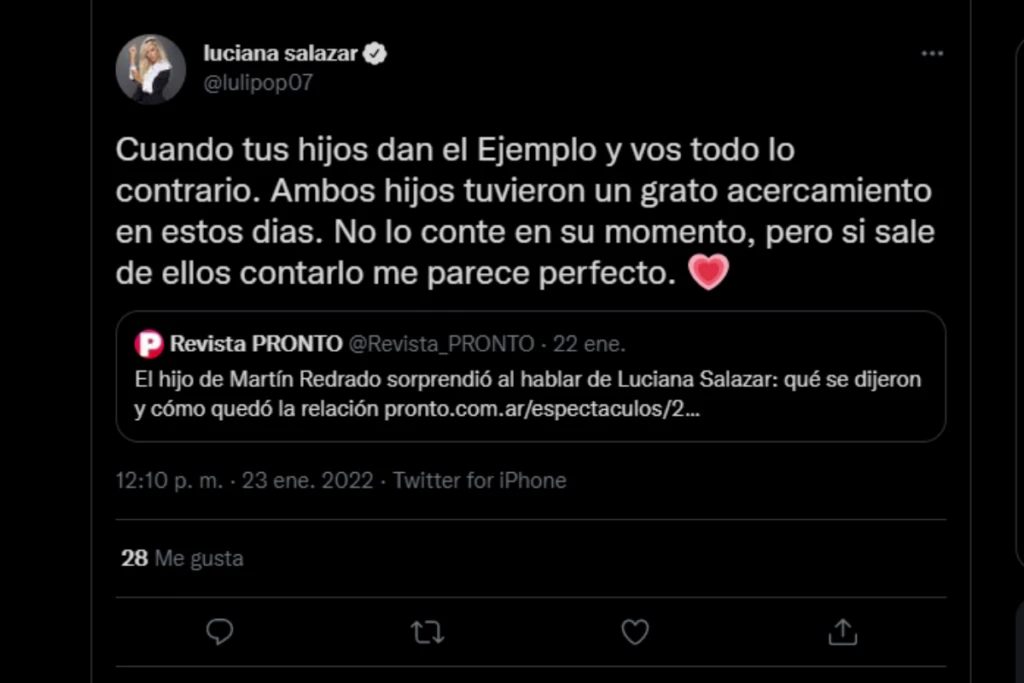 Hace algunas horas, después de ver la nota que la revista Pronto subió a su cuenta de Twitter sobre el tema, Luciana tomó su celular y marcó el terreno al respecto. La blonda citó el tweet y escribió: “Cuando tus hijos dan el ejemplo y vos todo lo contrario. Ambos hijos tuvieron un grato acercamiento conmigo en estos días. No lo conté en su momento, pero si sale de ellos contarlo me parece perfecto”, en un claro mensaje direccionado a su ex pareja.