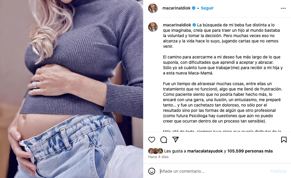 “La búsqueda de mi beba fue distinta a lo que imaginaba, creía que para traer un hijo al mundo bastaba la voluntad y tomar la decisión. Pero muchas veces eso no alcanza y la vida hace lo suyo, jugando cartas que no vemos venir. El camino para acercarme a mi deseo fue más largo de lo que suponía, con dificultades que aprendí a aceptar y abrazar. Sólo yo sé cuánto tuve que trabajar(me) para recibir a mi hija y a esta nueva Maca-Mamá”, explicó.