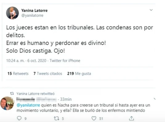 Pero eso no fue todo, para dejar clara su postura en la vereda opuesta a Guevara, Latorre continuó sentando su posición con el retuiteo de diversos mensajes de usuarios, con un tenor de ataque a la jurado. Así, en su feed aparecieron publicaciones como: “¿Quién es Nacha para creerse un tribunal si hasta ayer era un movimiento voluntario? ¿Y ella? Ella se burló de los enfermos mintiendo (…) Nacha hace años que vende su fórmula de la juventud y ahora no se hace cargo y los usa a los chicos para blanquear y justificarse”.