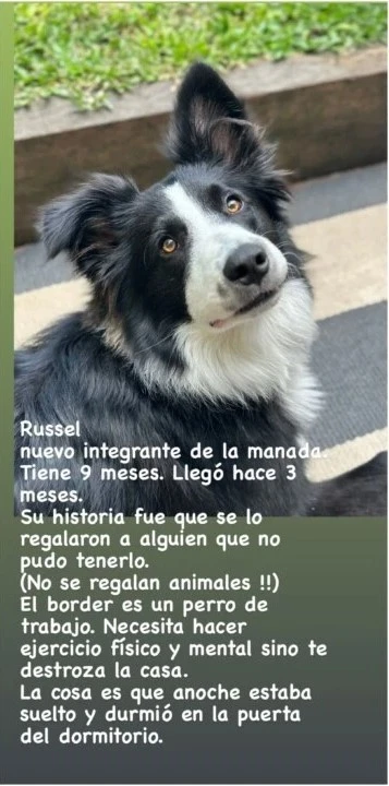 "Tiene 9 meses y llegó hace 3. Su historia fue que lo regalaron a alguien que no pudo tenerlo. ¡No se regalan animales! El Border es un perro de trabajo. Necesita hacer ejercicio físico y mental, sino te destroza la casa. La cosa es que anoche estaba suelto y durmió en la puerta del dormitorio. Como les dije, eran las 3 AM", sumó.