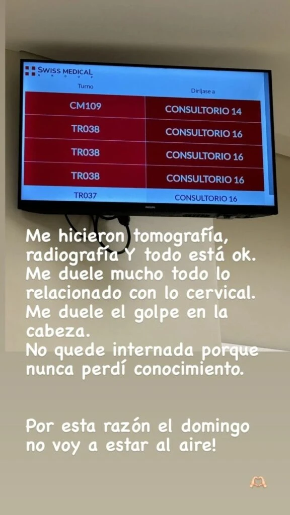 Y agregó: "El dolor… Me hicieron tomografía, radiografía, y todo está ok. Me duele mucho toda lo relacionado a la cervical. Me duele el golpe en la cabeza. No quedé internada porque nunca perdí el conocimiento. Por esta razón, el domingo no voy a estar al aire".