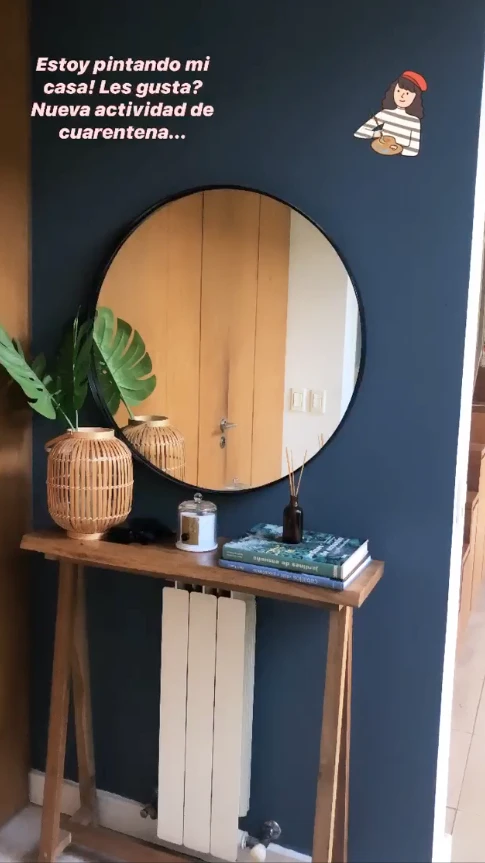 Además de los chicos, Marcela también eligió arreglar un espacio para adultos. Por eso, pintó una pared de la recepción del hogar de un color azul petróleo, un tono que es tendencia a la par del gris oscuro, y lo hizo con sus propias manos. Además agregó un espejo redondo colgado en la pared, otro ítem que es fundamental en la deco actual.