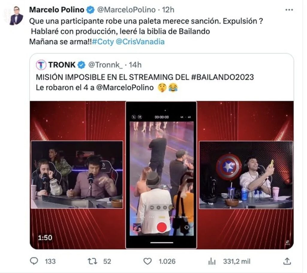 Polino al ver el video, decidió responder en las redes sociales súper picante contra la joven de Corrientes por el pésimo gesto que tuvo en medio del programa: "Qué una participante robe una paleta merece sanción ¿Expulsión? Hablaré con producción. Leeré la Biblia del Bailando. Mañana se arma".