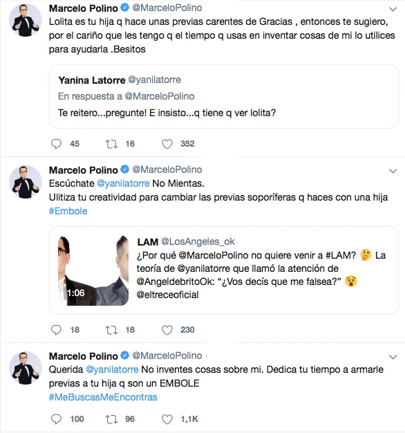 Y directo, Polino volvió a contesta: “Lolita es tu hija que hace unas previas carentes de gracia, entonces te sugiero, por el cariño que les tengo, que el tiempo que usás en inventar cosas de mí lo utilices para ayudarla. Besitos”.