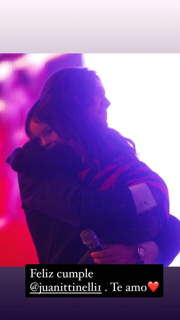 En las Stories, Tinelli también subió otra postal con Juanita en brazos. Si bien no aclara dónde fue sacada la fotografía, por el micrófono en mano parece ser que era en el estudio de Showmatch.
