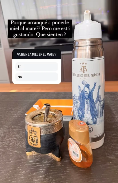 “Arranqué a ponerle miel al mate y me está gustando, ¿va bien en el mate?”, le consultó a sus seguidores con una encuesta para tratar de descubrir qué tanto se avala esta modalidad de tomar mate. En la foto se puede ver el termo que había expuesto en ocasiones anteriores, un mate también vinculado a la Selección Argentina y el pequeño frasco de miel que utiliza para endulzar.