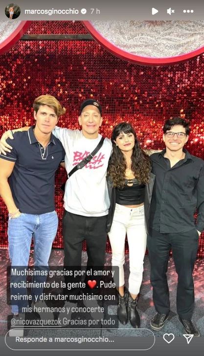 Terminada la función, Nicolás, como es su costumbre desde que debutó la obra semanas atrás, agradece al público presente. Y, en esta oportunidad, agregó un especial saludo para Marcos, al que le hizo un primer comentario, a modo de broma. "Marcos quiero que sepas que está no es una historia real. Esto lo armamos antes de que se supiese que iba a volver Gran Hermano", dijo Vázquez.