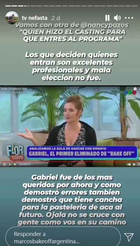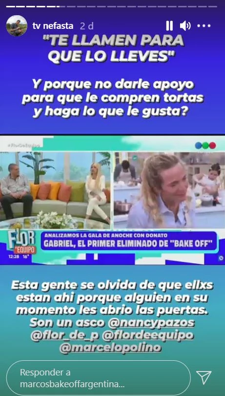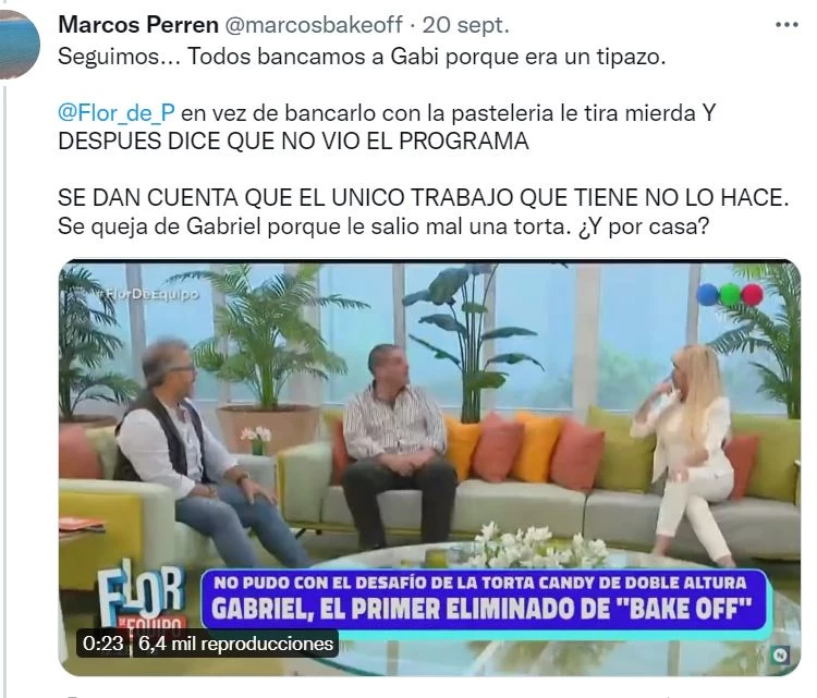 “Fue un placer haber estado acá. Estoy muy contento, fue un honor”, dijo Gabriel, y al otro día se sentó en el living de Flor de equipo como invitado, participación que fue criticadísima por otro ex Bake Off que se descargó con furia en sus redes contra el programa que conduce Flor Peña.