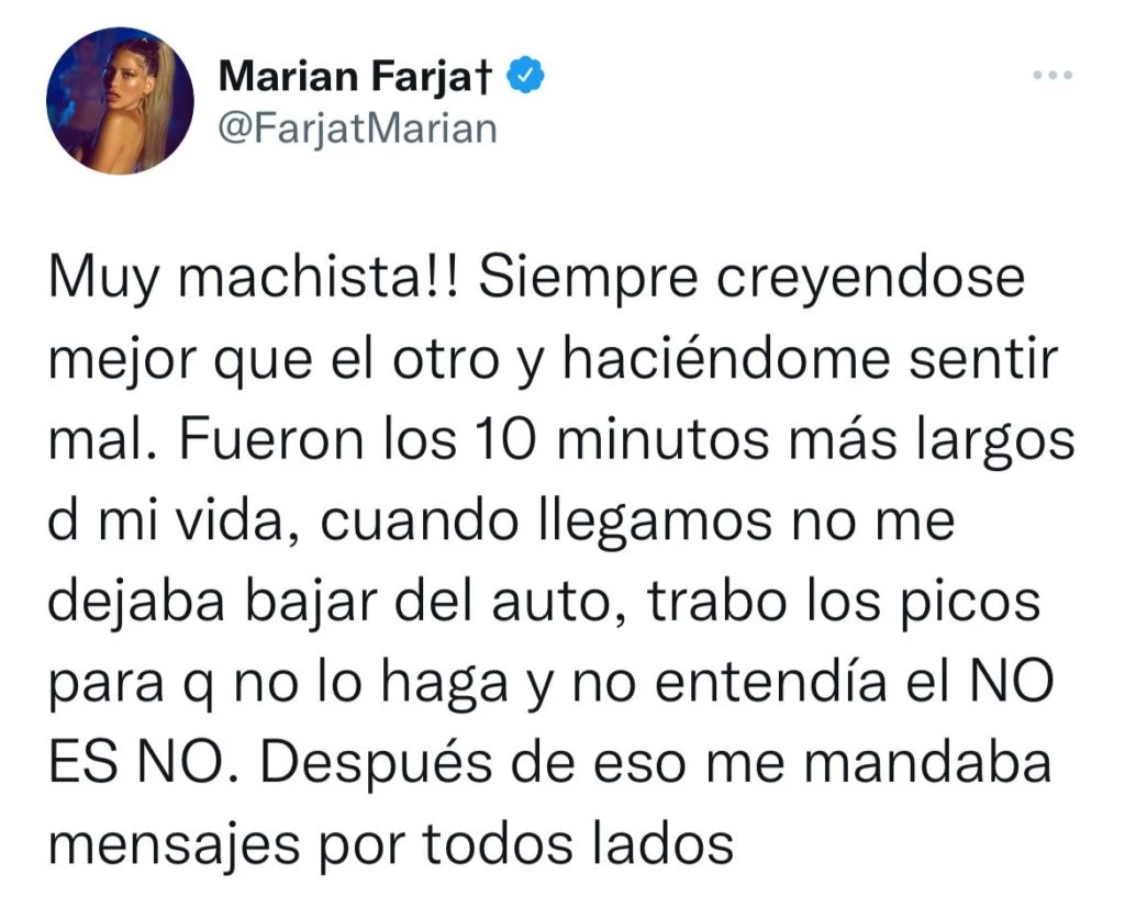 "Fueron los 10 minutos más largos d mi vida, cuando llegamos no me dejaba bajar del auto, trabó los picos para que no lo haga y no entendía el NO ES NO. Después de eso me mandaba mensajes por todos lados. Me llamó varias veces insistiendo pero nunca mas hablé ni lo volví a ver, no me llevé una muy buena imagen de él, no me gustó su forma de ser. Es una persona con la que nunca compartiría una charla. Y obviamente nunca mas lo volví a ver", finalizó.