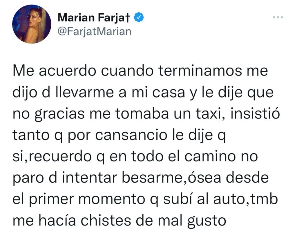 "Me acuerdo cuando terminamos me dijo de llevarme a mi casa y le dije que no gracias me tomaba un taxi, insistió tanto q por cansancio le dije q si,recuerdo q en todo el camino no paro d intentar besarme, o sea desde el primer momento que subí al auto, también me hacía chistes de mal gusto. Muy machista. Siempre creyendose mejor que el otro y haciéndome sentir mal", agregó.