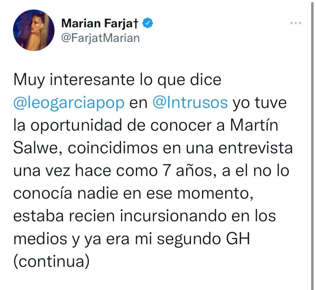 Y es que, resulta que Marian Farjat reveló en Twitter un fuerte momento que vivió con el mediático: "Muy interesante lo que dice @leogarciapop en @Intrusos yo tuve la oportunidad de conocer a Martín Salwe, coincidimos en una entrevista una vez hace como 7 años, a el no lo conocía nadie en ese momento, estaba recien incursionando en los medios y ya era mi segundo GH".