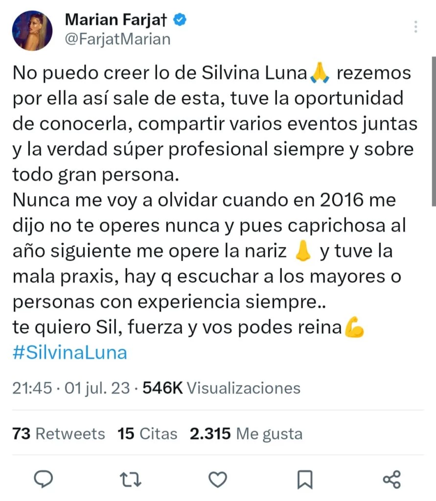 La ex GH escribió en Twitter: “No puedo creer lo de Silvina Luna. Recemos por ella así sale de esta”, además agregó como se conocieron: “Tuve la oportunidad de conocerla y compartir varios eventos juntas. La verdad siempre fue súper profesional, y sobre todo, gran persona”.